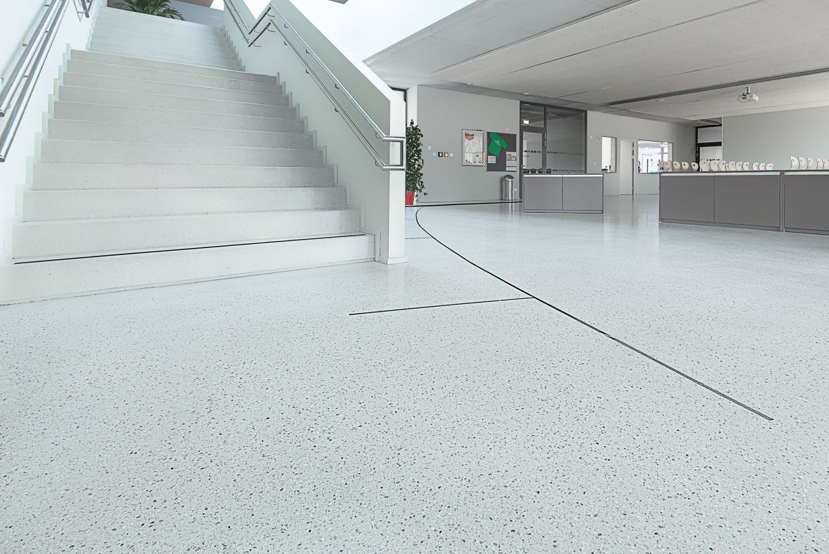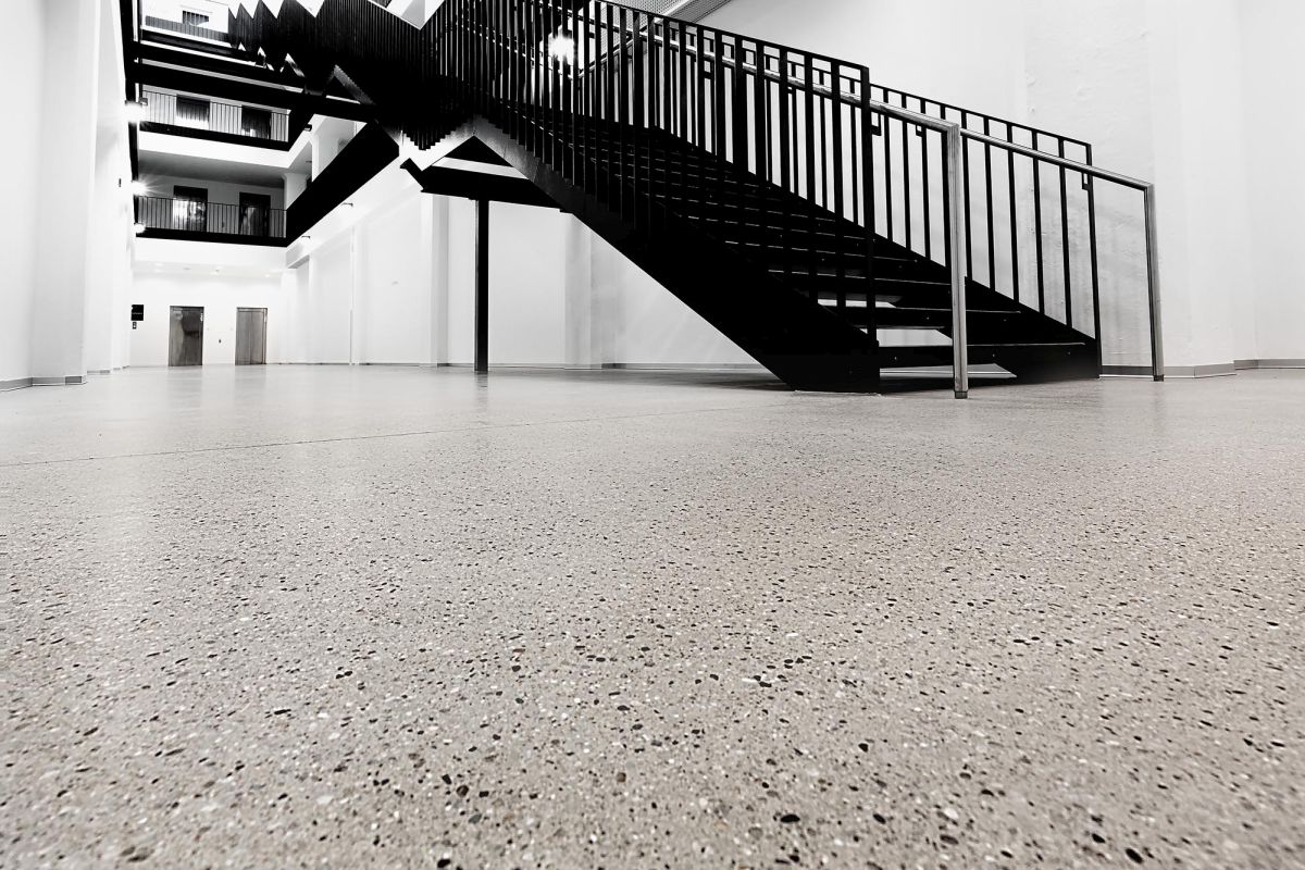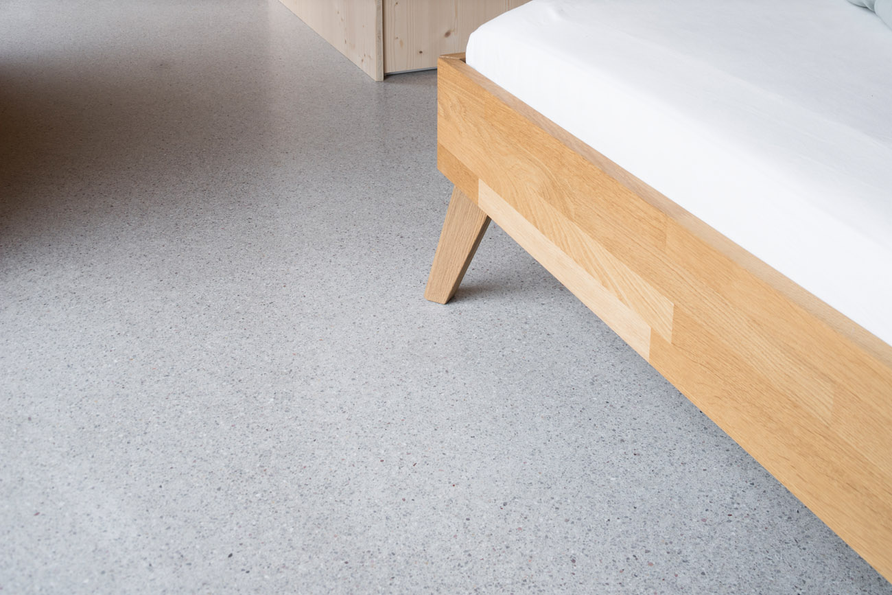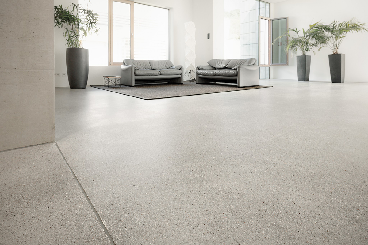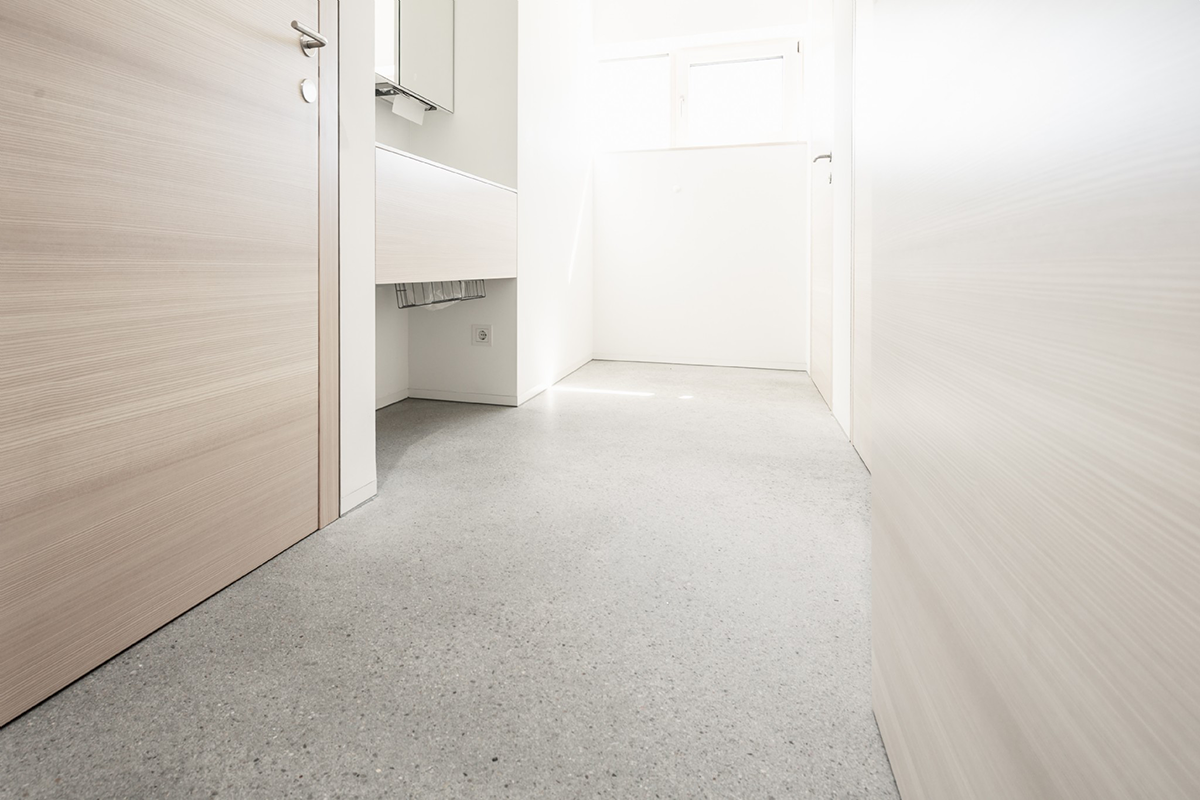 Natürliche Körnung gibt diesem Boden seinen Charakter. Der speziell eingebaute Estrich wird geschliffen und poliert. Das Ergebnis ist eine homogene Oberfläche, die leicht zu reinigen ist.