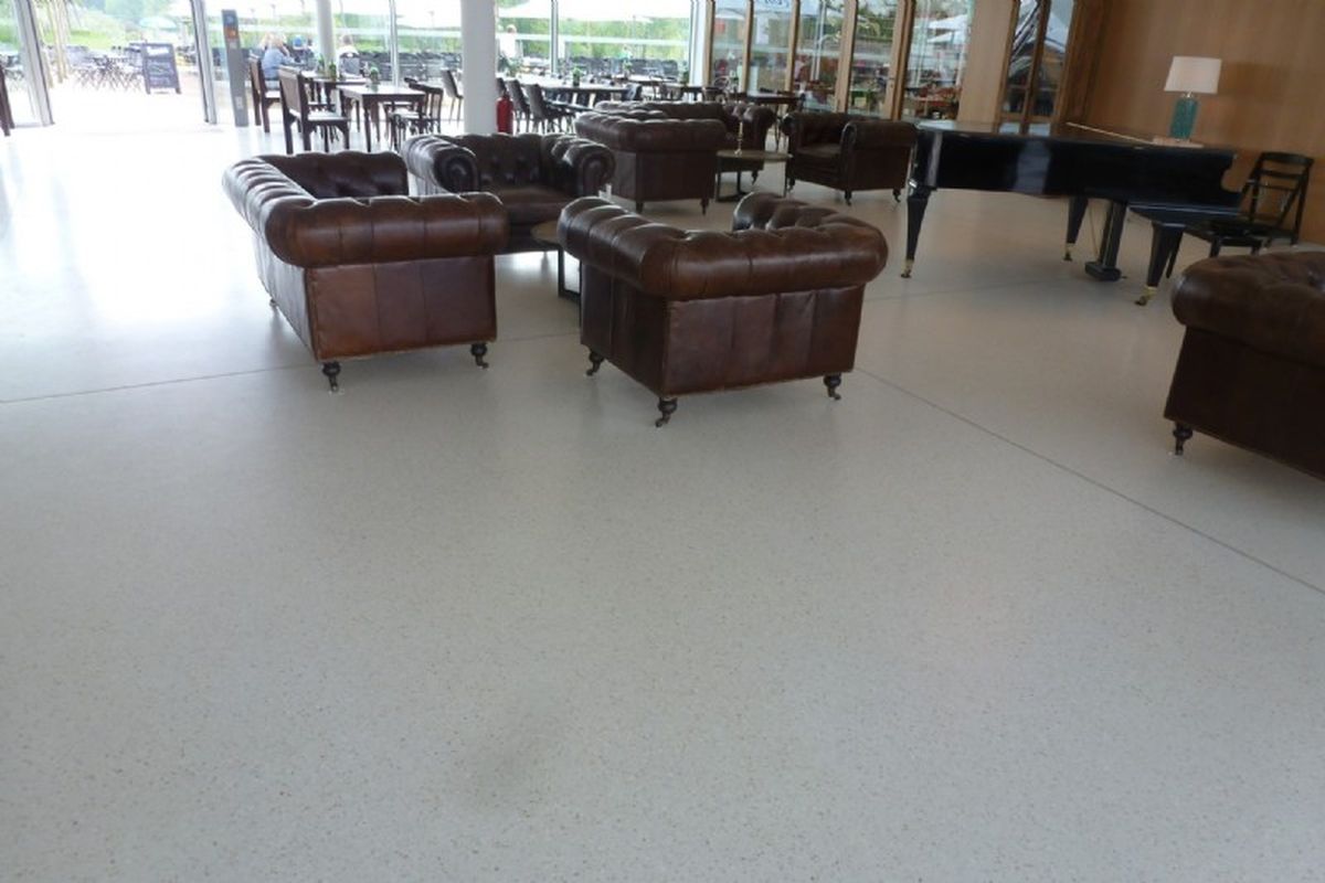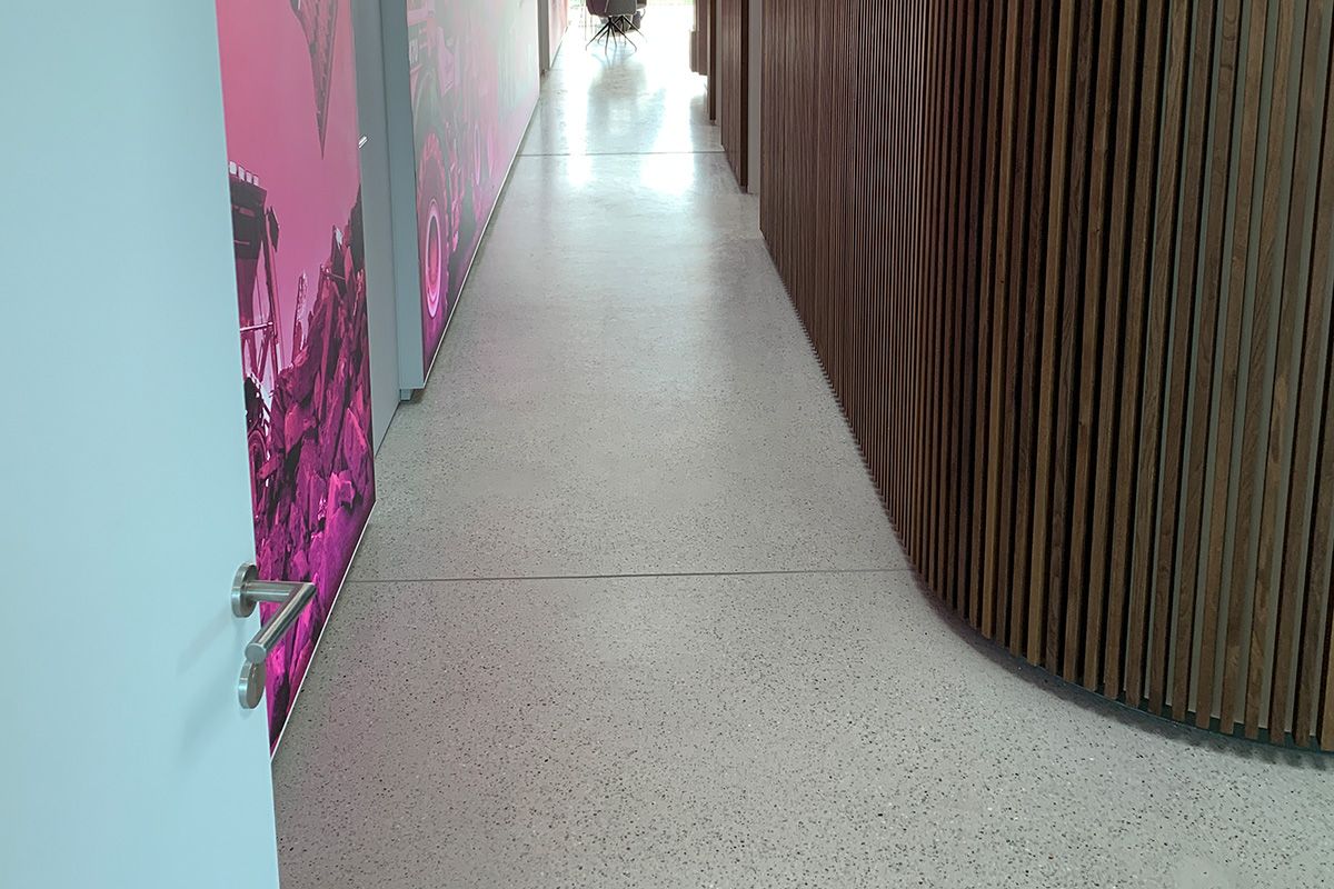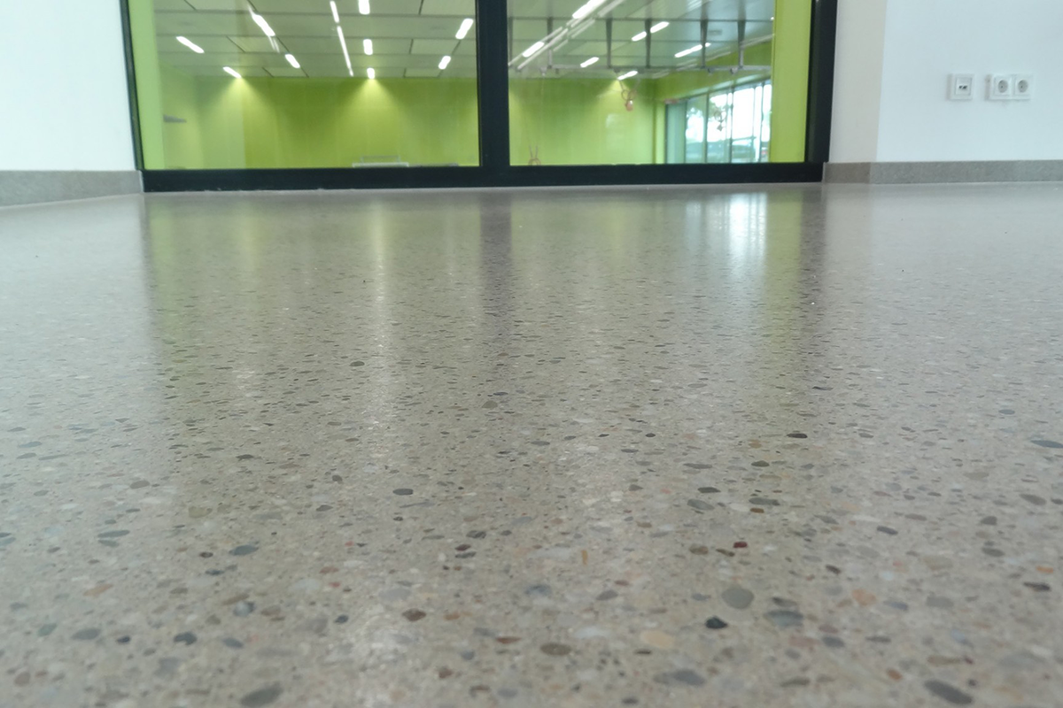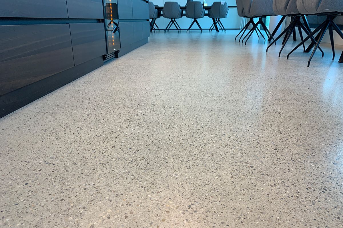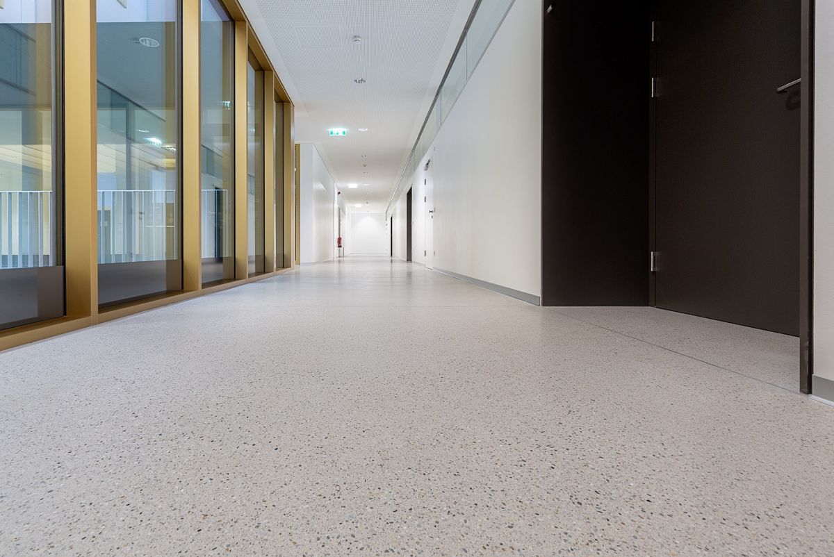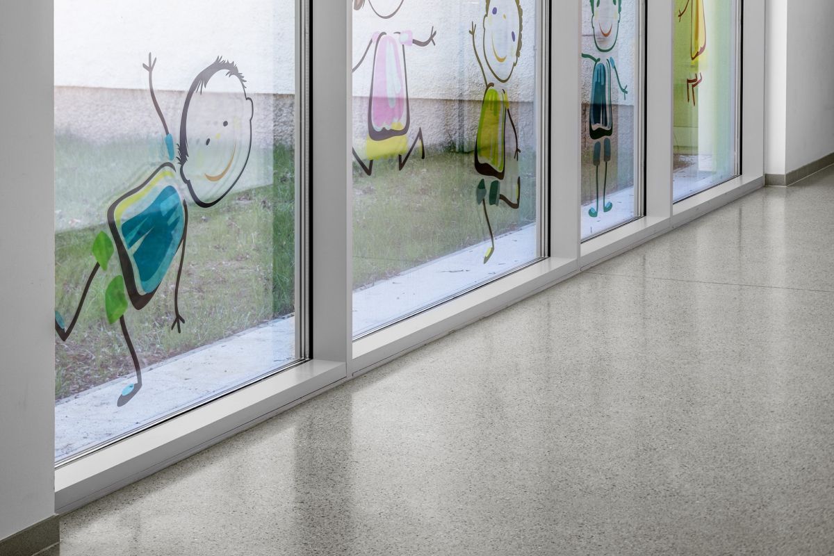 Natürliche Körnung gibt diesem Boden seinen Charakter. Der speziell eingebaute Estrich wird geschliffen und poliert. Das Ergebnis ist eine homogene Oberfläche, die leicht zu reinigen ist.