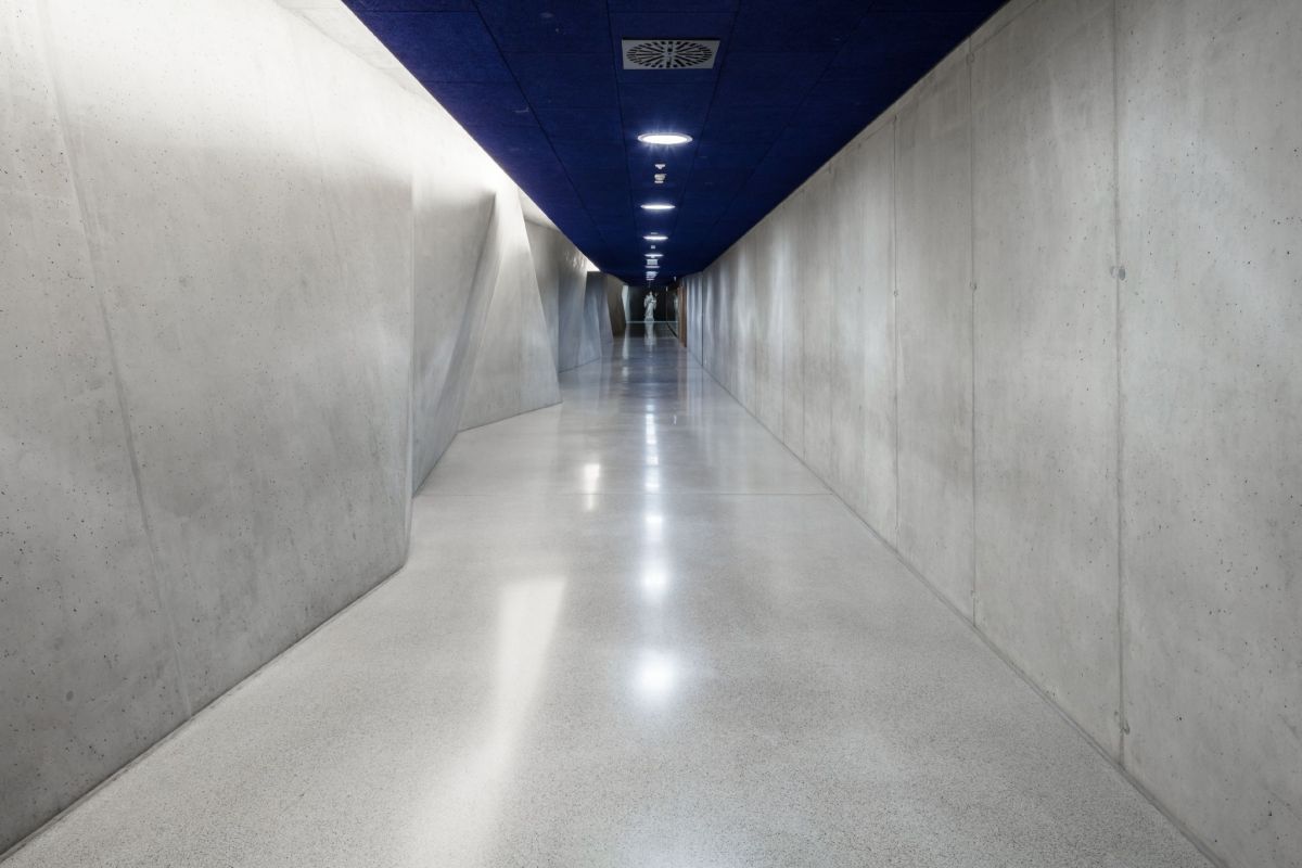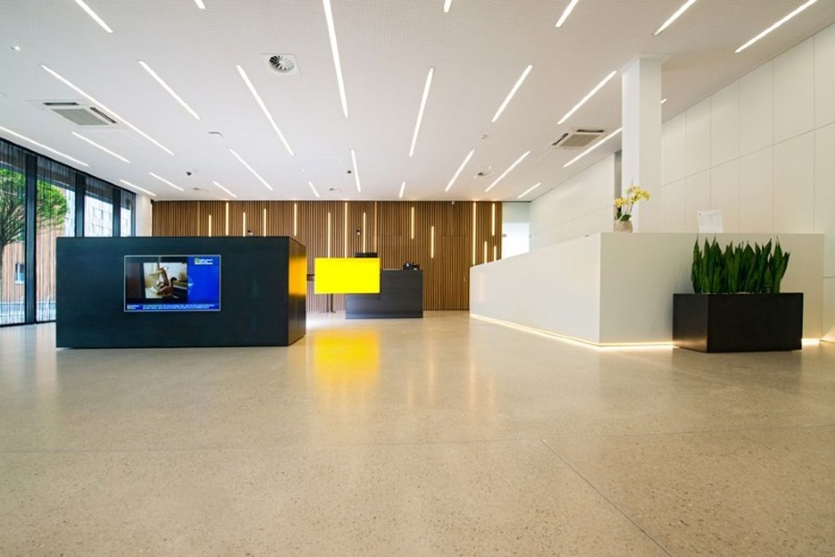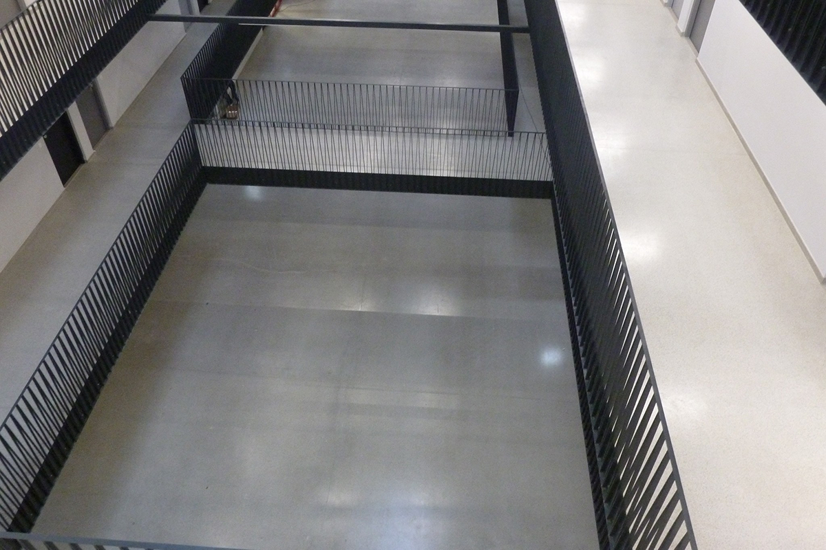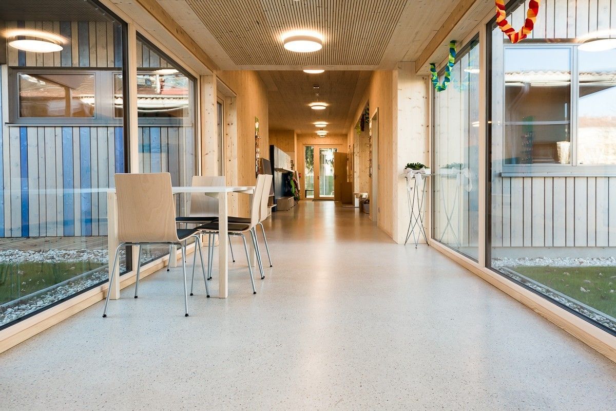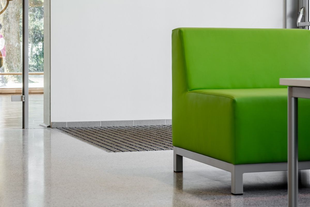 Natürliche Körnung gibt diesem Boden seinen Charakter. Der speziell eingebaute Estrich wird geschliffen und poliert. Das Ergebnis ist eine homogene Oberfläche, die leicht zu reinigen ist.